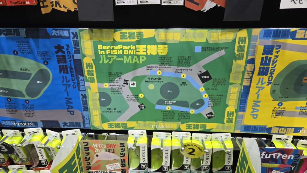 釣りフェスのJACKALLブースで事前にポイントマップをゲットしているので、イチロー池のポイントマップ上で①のあたりに釣り座を構えます。